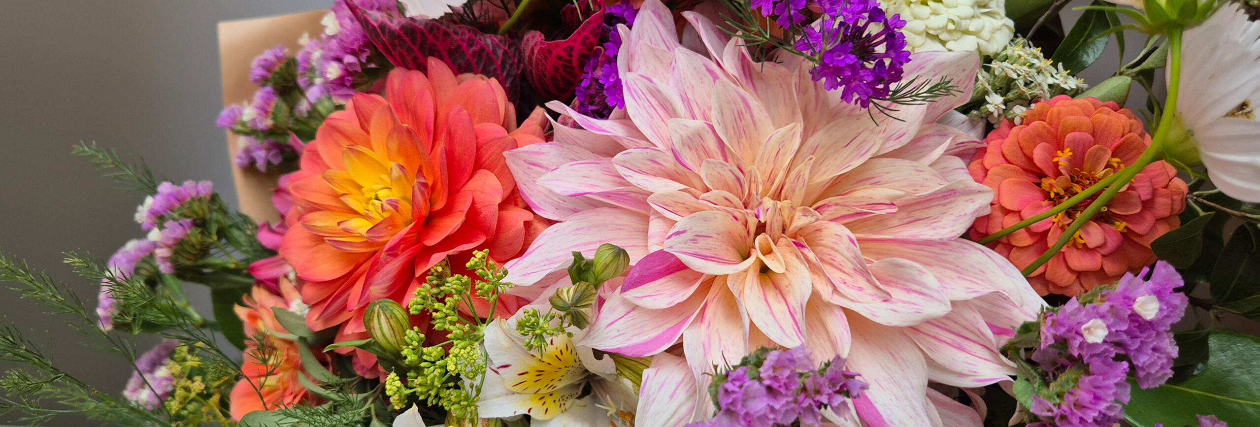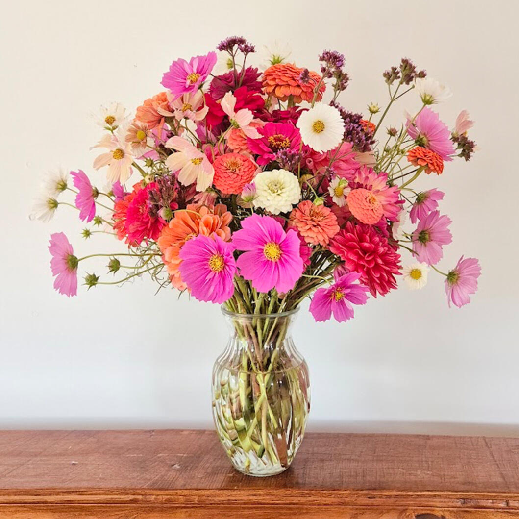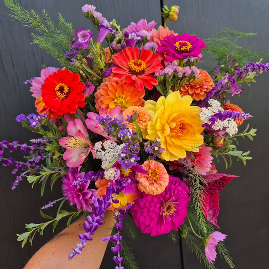 Hand-tied fresh flowers are cut to order and wrapped up with a neat little bow, just for you!As all of our flowers are grown right here, flower type and availability will vary depending on the season. Every bouquet is completely unique.